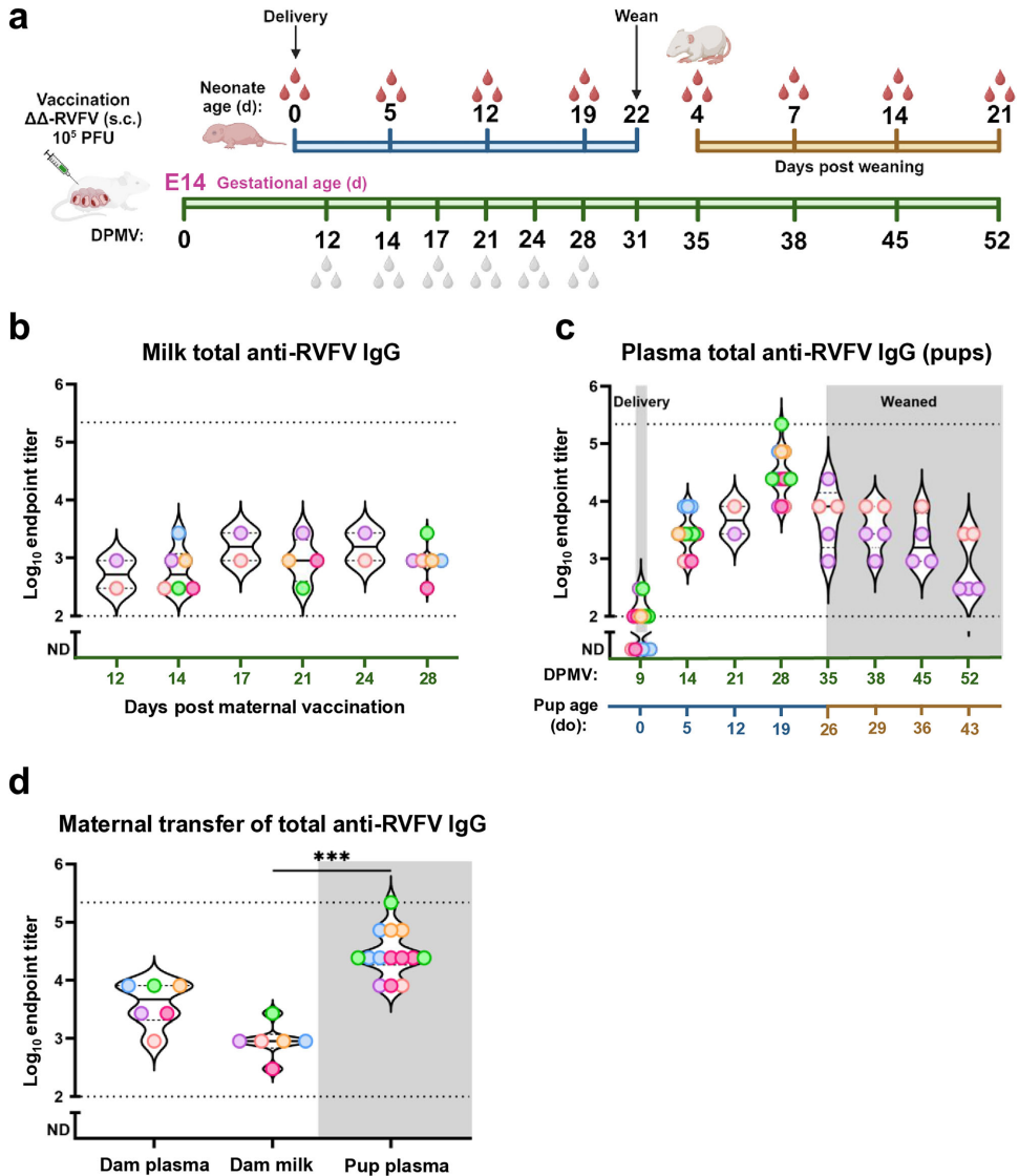 针对这一难题,匹兹堡大学(University of Pittsburgh)的研究团队开发了基于ZH501毒株的双基因缺失减毒疫苗RVFV-delNSs/NSm,通过删除毒力基因NSs和NSm实现安全性提升。在《npj Vaccines》发表的最新研究中,他们利用Sprague-Dawley大鼠模型,首次系统评估了孕期母源接种该疫苗后抗体转移效率及子代保护效果。结果显示:接种母鼠乳汁中持续存在高滴度抗RVFV IgG,子代通过哺乳获得的抗体水平甚至超越母体,且能100%抵抗致死剂量野生型病毒攻击。更引人注目的是,59%的子代在断奶21天后仍保有中和活性,而DIVA检测表明85%的存活幼鼠未出现针对NSs蛋白的血清转换,提示母源抗体可能提供"灭菌免疫"。