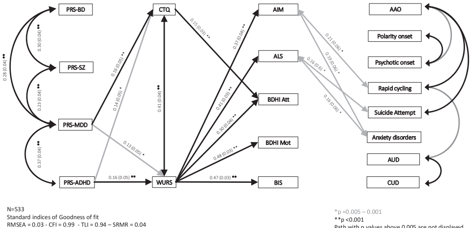 研究团队对852名欧洲裔BD患者进行了系统性分析,采用LDpred2算法计算四种精神疾病(BD、精神分裂症[SZ]、重度抑郁症[MDD]和ADHD)的PRS,结合童年创伤问卷(CTQ)和犹他评定量表(WURS)等维度评估,构建了从遗传风险到临床表现的完整路径模型。关键技术包括:1)基于千人基因组计划的 ancestry控制;2)HRC r1.1参考面板的基因型插补;3)使用Process宏和Mplus 8.8进行调节-中介建模。