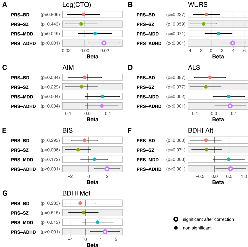 PRS-ADHD显示出最广泛的关联网络,与童年虐待(CTQ, p=7×10-5)、童年ADHD症状(WURS, p=3×10-8)及成年期情感不稳定(ALS, p=4×10-4)显著相关。相比之下,PRS-BD仅与BD-I亚型微弱关联(p=0.033)。
