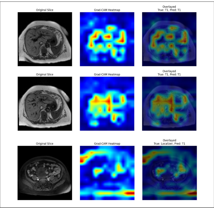 研究构建的12类脉冲序列分类模型在测试集达到99.51%的准确率。通过分析发现,局部定位器(Localizer)序列偶尔会被误判为T1加权像,这源于两者在快速梯度回波技术上的相似性。Grad-CAM可视化显示,模型在判断T1加权像时重点关注肝叶前部、胸主动脉及周围腹部脂肪区域,这些正是放射科医师常关注的诊断区域。