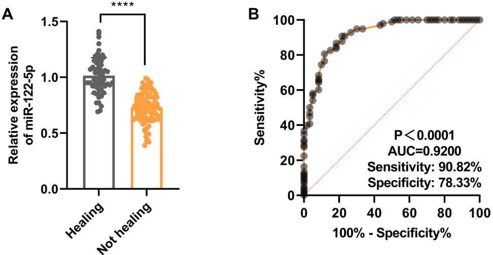 血清miR-122-5p区分骨不连的曲线下面积(AUC)达0.89,截断值处灵敏度90.82%,特异性78.33%。