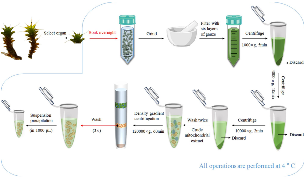 石河子大学生命科学学院(Key Laboratory of Xinjiang Phytomedicine Resource and Utilization of Ministry of Education)的研究团队在《Plant Methods》发表突破性方案。他们创新性地采用4℃低温浸渍预处理,配合优化后的提取缓冲液(含HEPES、PVP和抗坏血酸钠),通过差速离心与23%/35%/42% Percoll不连续密度梯度离心,成功从50克苔藓中分离出56.7毫克线粒体。关键技术包括:低温浸渍保护细胞膜完整性、sorbitol替代蔗糖维持渗透压、三阶段Percoll梯度纯化去除叶绿体污染。