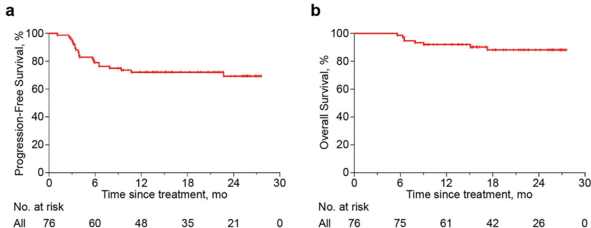 76例患者中72%为晚期(III/IV期),79%伴乳酸脱氢酶(LDH)升高。基因分型显示MCD-like(25%)和BN2-like(20%)为主要亚型,70%为非生发中心B细胞(non-GCB)来源。