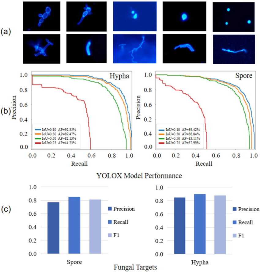 YOLOX模型性能 在IoU阈值为0.1时,菌丝检测精确度达85%(F1-score=0.88),孢子检测为77%(F1-score=0.81)。