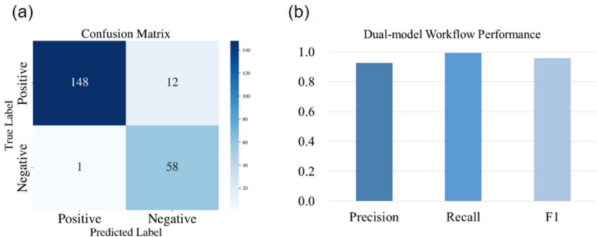 集成系统效能 双模型联合分析的总体精确度92.5%,召回率99.3%,Kappa值0.857,显著优于单一模型。