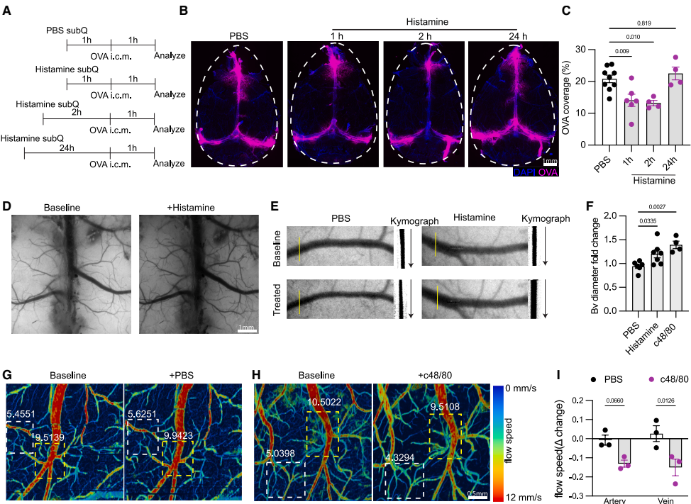 研究团队发现硬脑膜肥大细胞富集于ACE点周围,通过单细胞RNA测序证实其高表达组氨酸脱羧酶(Hdc)和Mrgprb2受体。使用化合物48/80激活肥大细胞后,CSF向硬脑膜的流出显著减少,这种效应在肥大细胞缺陷型KitW-sh小鼠中消失。通过双光子显微成像证实,该过程伴随桥静脉周围间隙的缩小。