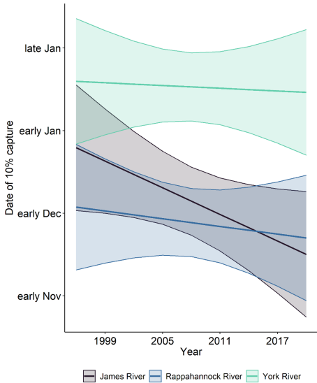 在时间维度上,研究发现詹姆斯河幼鱼10%捕获日期较1990年代提前4天/年(p=0.048),