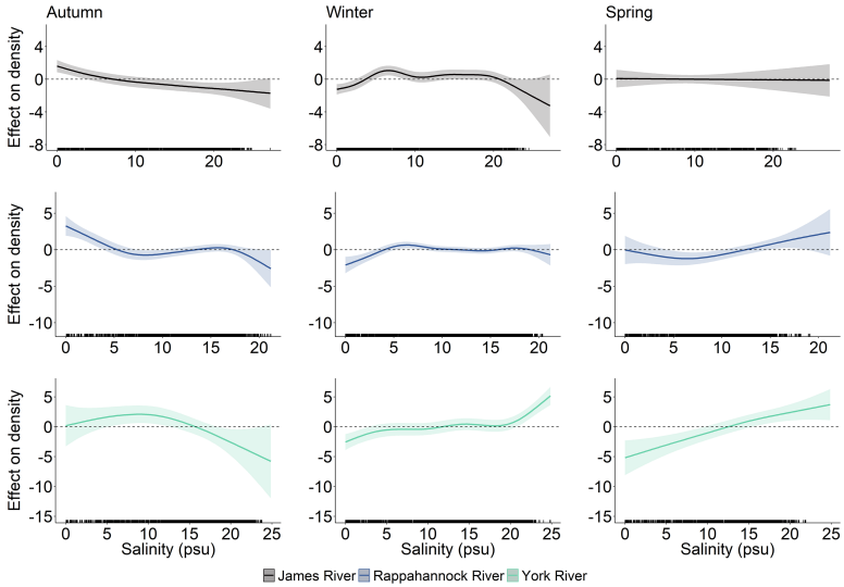研究人员创新性地整合了多种技术方法:利用渔业独立底拖网调查(VIMS Juvenile Fish Trawl Survey)获取1996-2023年詹姆斯河、约克河和拉帕汉诺克河三个亚河口的月度鱼类丰度数据;通过广义加性模型(GAMs)分析盐度、温度等环境因子与幼鱼分布的关联;运用GIS空间分析确定密度中心迁移路径;结合美国地质调查局(USGS)水文站数据评估河流流量影响。特别值得注意的是,研究建立了基于10%捕获量的时间阈值法,量化幼鱼迁移时序变化。