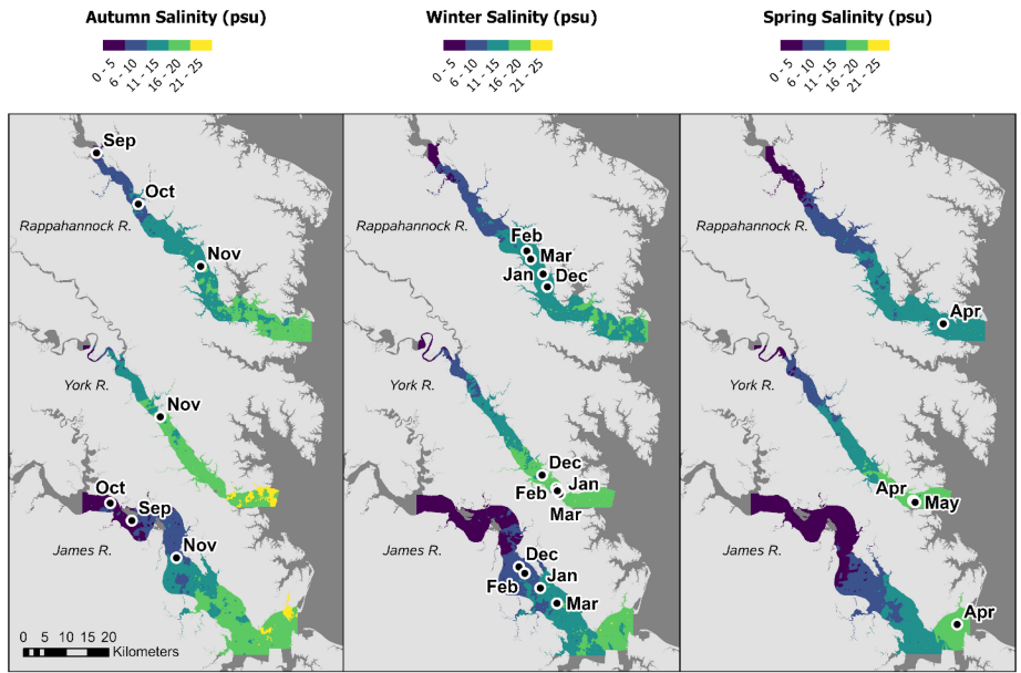 针对蓝背鲱(Alosa aestivalis)种群持续衰退问题,Virginia Institute of Marine Science团队通过28年渔业调查数据,揭示幼鱼在切萨皮克湾亚河口的栖息地偏好与时空分布规律,发现其秋季偏好低盐度(0-10 psu)水域、冬季集中在中游区域、春季向河口聚集的迁移特征,为制定季节性施工限制(TOYs)保护关键生命阶段提供科学依据。