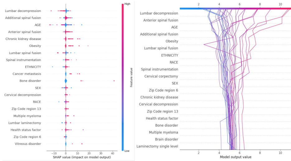 【Explainable artificial intelligence】部分通过SHAP决策图证实,腰椎减压术(CPT 63030)与慢性肾病(ICD-10:N18)分别使LOS预测值增加2.3天和1.8天,而60岁以下年龄可使预测缩短1.5天。