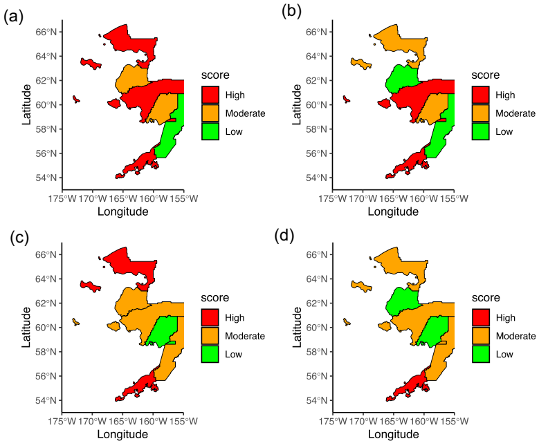 【社区风险格局】风险评估揭示阿留申东部(Aleutians East)始终处于高风险状态,其风险值(3.8/4)源于渔业参与度高(固定渔具上岸量占全州28%)、经济依赖性强的特点。相比之下,库西尔瓦克(Kusilvak)因低依赖性和高适应能力(道路通达率87%)风险最低。值得注意的是,纳入适应能力指标后,布里斯托尔湾等四个社区风险值反而上升,反映现有社会经济条件难以缓冲资源流失冲击。