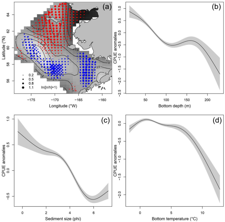 【太平洋鳕分布预测】模型显示太平洋鳕丰度与中层大陆架水温呈显著空间异质性:北部EBS每升温1°C使CPUE(单位努力渔获量)增加15%,而南部同幅升温导致CPUE下降22%。到本世纪末,SSP5-8.5情景下太平洋鳕在北部EBS的占比将从历史平均33%升至54%,呈现明显的"极向转移"(polar shift)。