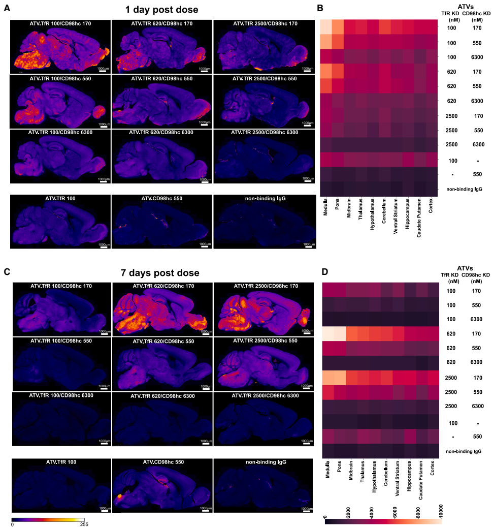 通过系统调节9种不同亲和力组合发现:强TfR亲和力驱动快速入脑(Tmax=1天),但伴随快速代谢;而强CD98hc亲和力则带来缓慢但持久的脑部滞留(Tmax=7天)。这种"调速"能力使dual TV能根据不同治疗需求定制暴露曲线——需要快速起效时增强TfR结合,需长效作用时则强化CD98hc结合。
