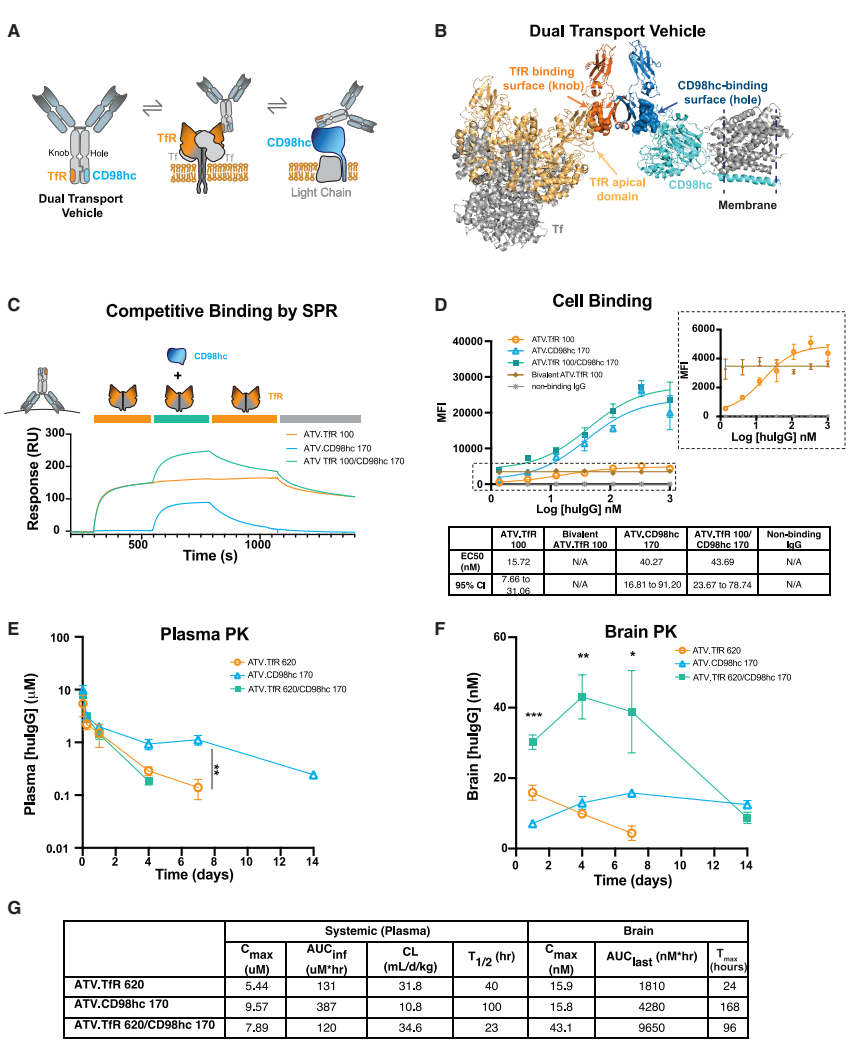 Denali Therapeutics, Inc.的研究团队创新性地将两种策略合二为一。他们发表在《Cell Reports》的研究中,通过工程化改造人源IgG1 Fc片段,构建了能同时靶向TfR和CD98hc的双重运输载体(dual TV)。这种双特异性分子采用"knob-into-hole"技术,在一个Fc片段上分别整合TfR和CD98hc结合位点。研究显示,dual TV不仅保留了两种受体的独立结合能力,还产生了协同效应——当TfR像"特快专列"将药物快速送入大脑时,CD98hc则像"智能停车系统"减少药物被神经元过快清除,从而显著提升脑部药物浓度和滞留时间。