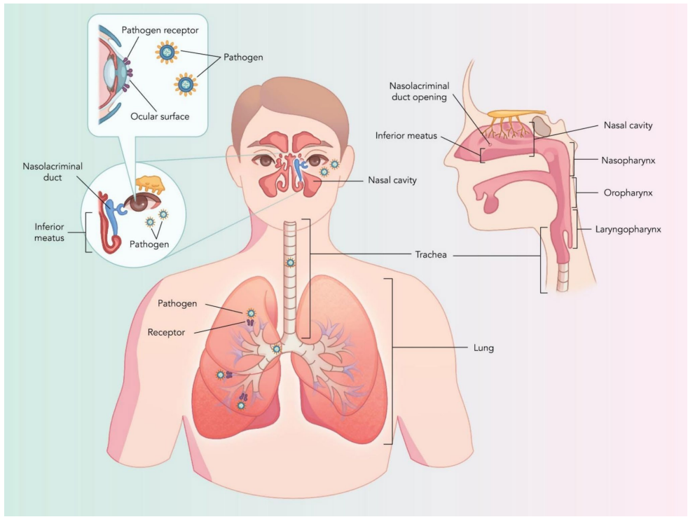 呼吸系统和眼部共享独特的黏膜免疫网络。眼相关淋巴组织(EALT)与支气管相关淋巴组织(BALT)通过分泌型免疫球蛋白A(sIgA)形成防御屏障。动物实验显示,眼表接种流感病毒可诱导肺部IgA反应,而鼻腔免疫能提升泪液IgA水平1.4倍,证实黏膜免疫的跨系统通讯。鼻泪管(NLD)作为物理通道,允许病原体如SARS-CoV-2和呼吸道合胞病毒(RSV)双向扩散,其内壁的ACE2和TMPRSS2受体为病毒入侵提供门户。