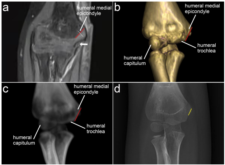 【Identification of a safe medial pinning zone based on reconstructed elbow images】章节揭示:MRI清晰显示尺神经走行于斜线下段沟槽内(图1a),3D-CT重建证实上段斜线区域无神经干扰(图1b)。侧位视图中,无论C臂机如何倾斜,由冠突窝与鹰嘴窝皮质汇聚形成的钻石形结构始终存在(图2),这个被命名为"钻石区"(diamond zone)的区域与尺神经解剖位置保持安全距离。