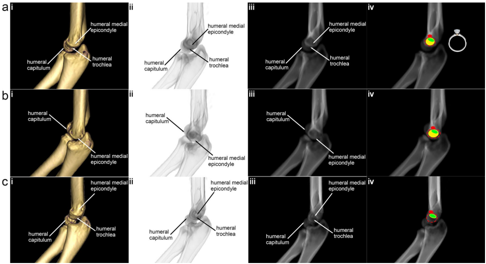 西安交通大学附属红会医院与中南大学湘雅医院的研究团队在《BMC Musculoskeletal Disorders》发表的研究给出了创新解决方案。研究人员创造性地运用E3d软件三维重建技术,首次在影像学层面精确定位了"绝对安全区":在前后位(AP)视图中,将肱骨内上髁边界斜线(slope line)分为上下两段,证实上段为安全穿针区(该区域尺神经走行于后方沟槽);在侧位视图中,通过多角度重建确认由冠突窝与鹰嘴窝皮质形成的"钻石环征"(diamond ring sign)区域为安全穿刺靶区。这项发现为临床操作提供了直观可靠的导航标志。