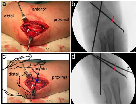 【Ulnar nerve exploration】证实:当肘关节屈曲时,偏离安全区的克氏针会压迫前移的尺神经(图4a)。神经探查术中发现,原穿针位点(斜线下段)确实与神经损伤相关(图4b),而采用"左手定位法"确定的新穿刺点(图4c)完美避开神经路径(图4d)。