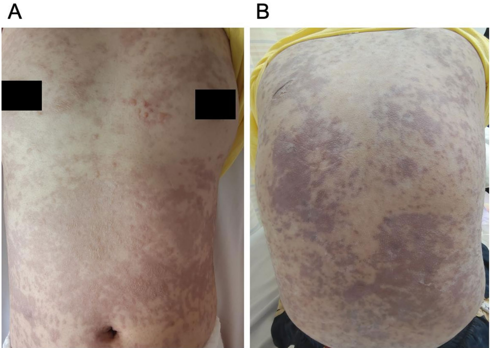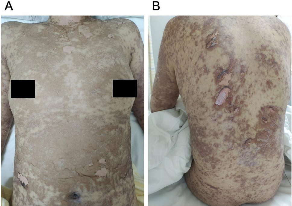 临床特征演变:患者初始皮肤表现符合Stevens-Johnson综合征(SJS),但4天内迅速进展为TEN,体表受累面积从<10%扩展至36%。皮肤病变呈现特征性演变过程: