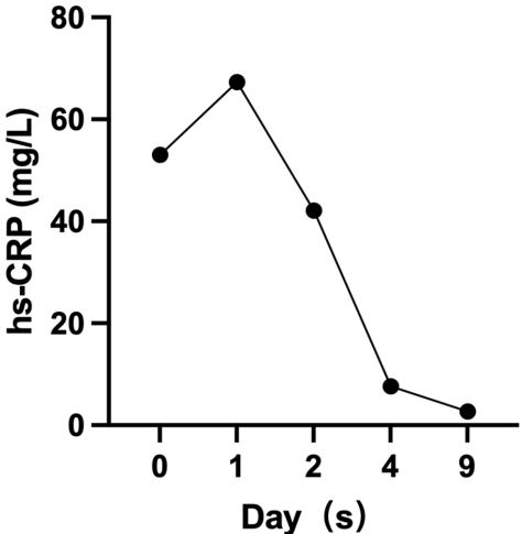 实验室指标异常:患者出现白细胞减少(WBC 3.02×109/L)、低蛋白血症(ALB 37.7 g/L)及显著炎症反应(hs-CRP 67.3 mg/L),治疗后hs-CRP水平呈持续下降趋势: