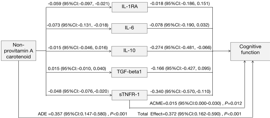浙江大学医学院附属第二医院公共卫生学院联合哈佛大学陈曾熙公共卫生学院的研究团队,利用美国健康与退休研究(HRS)这一全美最大老年纵向队列,对6015名50岁以上参与者展开为期7年的追踪。通过163项食物频率问卷(FFQ)评估膳食摄入,结合每两年一次的27分制认知功能评分(包含即时回忆、延迟回忆等维度),发现非维生素A原类胡萝卜素日均摄入量达12.6mg的群体(Q5)比3.0mg群体(Q1)认知评分显著提高0.288分,且该关联部分由可溶性肿瘤坏死因子受体-1(sTNFR-1)介导。而维生素A原类胡萝卜素仅在视黄醇摄入量高于531.2μg/d的群体中显现保护作用(Q4 vs Q1差异0.408分),提示两类营养素存在交互效应。