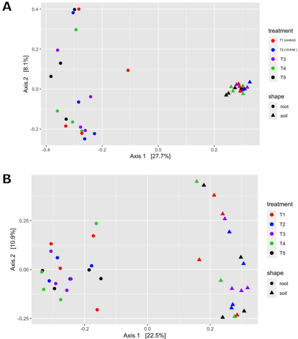 【Bacillin 20对细菌α多样性和群落结构的影响】通过Shannon和Simpson指数分析发现,处理组间α多样性无显著差异,但Chao1指数显示显著变化(p=0.002)。PCoA分析表明根际和根内菌群结构差异显著(p≤0.001),且黏壤土中的根际菌群相似度更高。