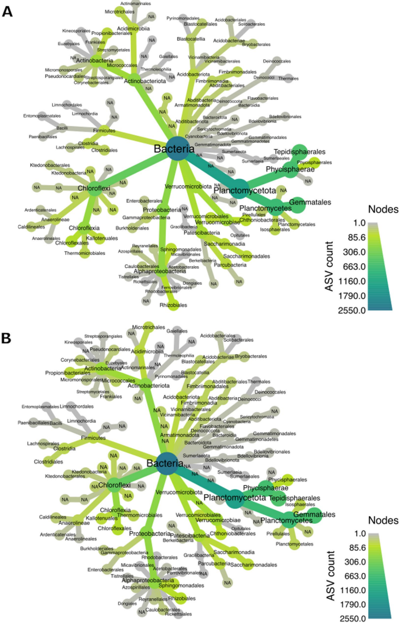 【Bacillin 20对细菌类群丰度的影响】热树模型显示19个细菌门在样品中分布,其中Planctomycetota、Chloroflexi和Proteobacteria为优势菌门。Gemmatales是最丰富的菌目,而Rhizobiales在根际土壤中丰度最高。