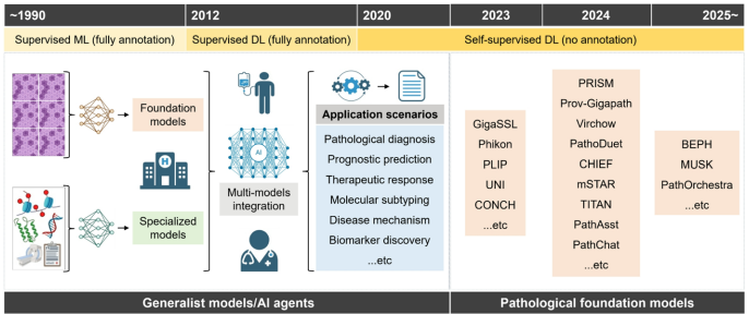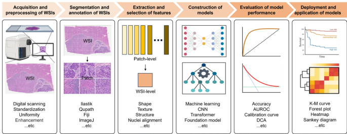 病理组学工作流程涵盖全切片图像(WSI)的获取与预处理、区域分割与标注、特征提取与筛选、模型构建及临床部署。如图1所示,通过卷积神经网络(CNN)或视觉Transformer(ViT)架构,AI能分析HCC组织中的细胞形态、核质比等特征,结合多实例学习(MIL)机制聚焦关键区域。新兴的病理基础模型(PFMs)通过自监督学习降低标注需求,为开发垂直领域专用模型提供支撑。