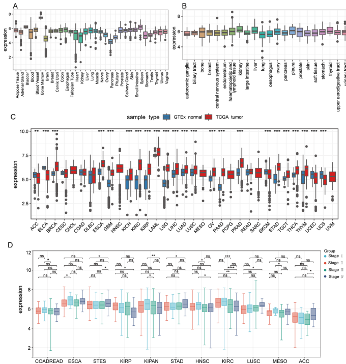 研究发现NCOA4在骨髓和脾脏等免疫器官高表达,在18种癌症(如BRCA、ESCA、LUAD)中显著上调,但在ACC等5种肿瘤中下调。值得注意的是,NCOA4表达随肿瘤进展呈动态变化,在COADREAD等7种癌症中随分期升高而降低,而在STAD等4种肿瘤中呈现相反趋势。