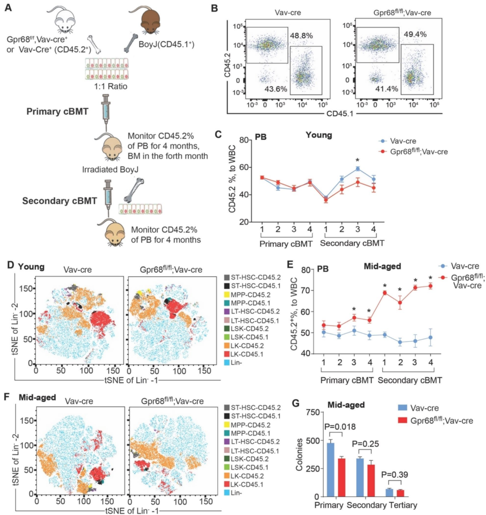 功能增强:竞争性移植实验显示,中年敲除小鼠的LT-HSC贡献率显著提高,二次移植后供体嵌合率增加2倍,证实GPR68缺失增强衰老HSC功能。