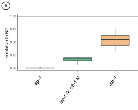 线粒体编码ETC突变体(cox-1、ctb-1)的初始适应度显著高于核编码突变体(gas-1、isp-1),其中isp-1单突变体适应度最低。双突变体isp-1 IV; ctb-1 M的适应度介于两个单突变体之间,证实了CTB-1对ISP-1突变的表型补偿效应。