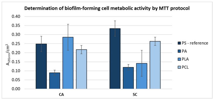 研究采用四大关键技术:1) 静电纺丝制备标准化纳米纤维材料;2) 72小时静态培养建立单菌种生物膜模型;3) 菌落形成单位(CFU)计数作为金标准验证;4) 改良MTT法结合甲萘醌增强信号,通过分光光度法(595 nm)定量代谢活性。实验设计包含严格对照,所有材料均经环氧乙烷灭菌处理。