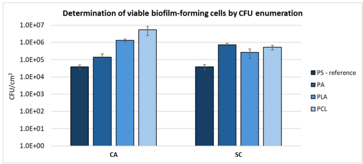 通过CFU计数发现,两种酵母在所有测试材料上的生物膜密度均显著高于聚苯乙烯(PS)对照(p<0.05)。其中C. albicans在PA上的定植能力明显弱于PCL和PLA(p<0.01),而S. cerevisiae在不同材料间差异较小。