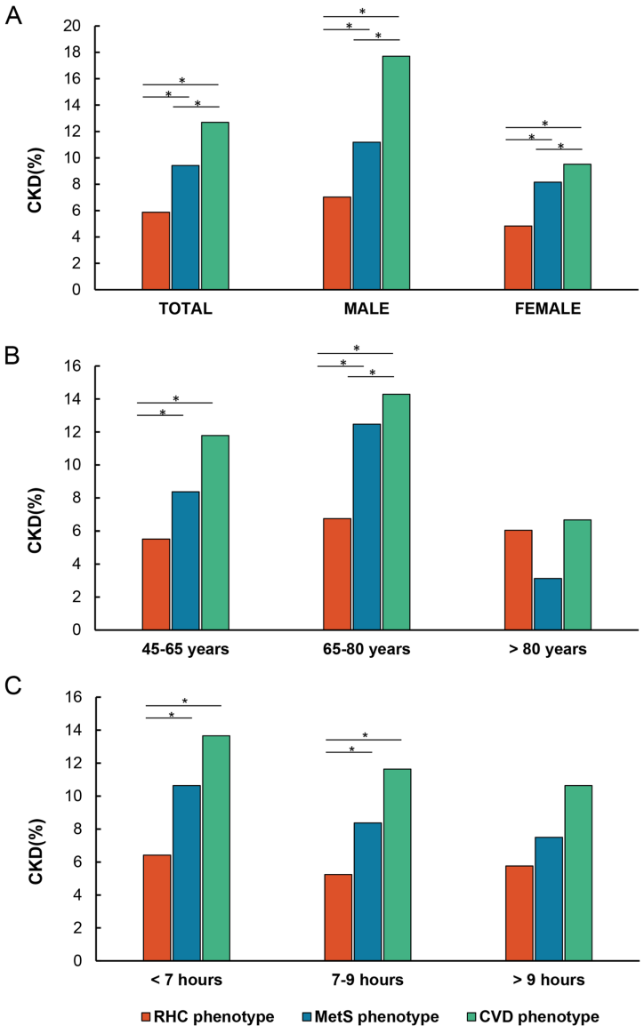 CKD风险梯度:随访5年后,CVD组CKD发病率最高(12.7%),其次是MetS组(9.4%),RHC组最低(5.9%)。调整混杂因素后,MetS和CVD表型的CKD风险分别增加54%(OR=1.54)和104%(OR=2.04)。