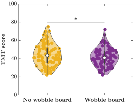 研究通过线性混合效应模型验证了实验设计的有效性:wobble board使TMT连接数显著减少2.34±1.00(p=0.021),同时引发压力中心(CoP)在ML轴的摆动范围扩大1.411±0.512cm(p=6.020×10-3)。瞳孔测量显示,机械不稳定性和认知任务分别使瞳孔直径增加0.078±0.016mm(p=6.470×10-11)和0.053±0.016mm(p=6.210×10-6),证实了双重任务对认知负荷的叠加效应。