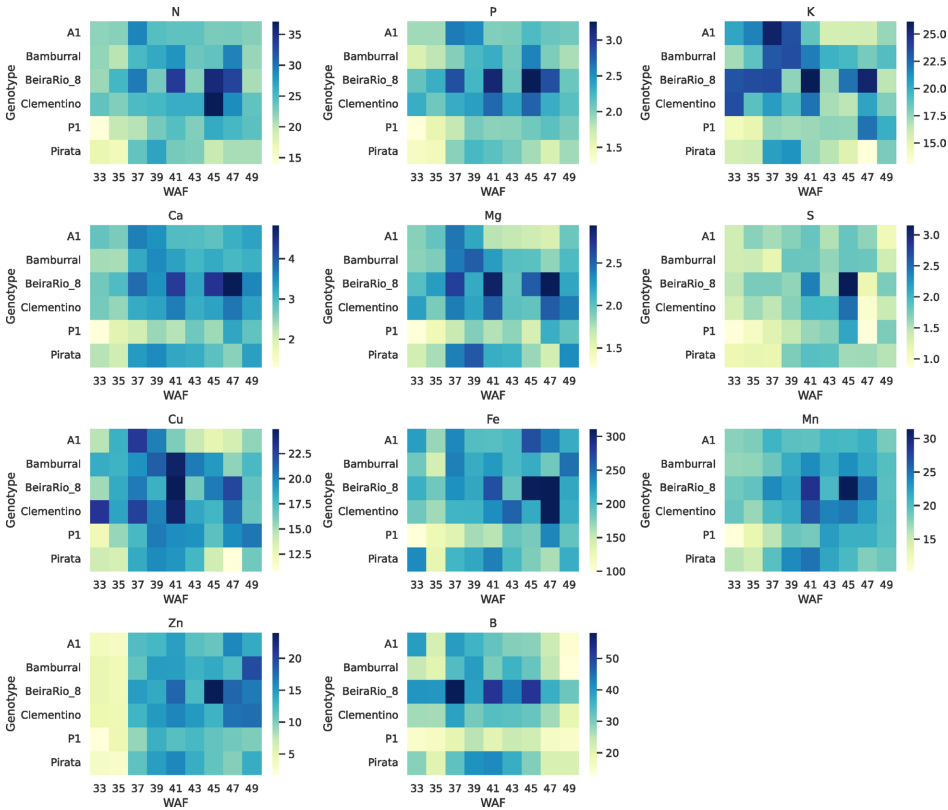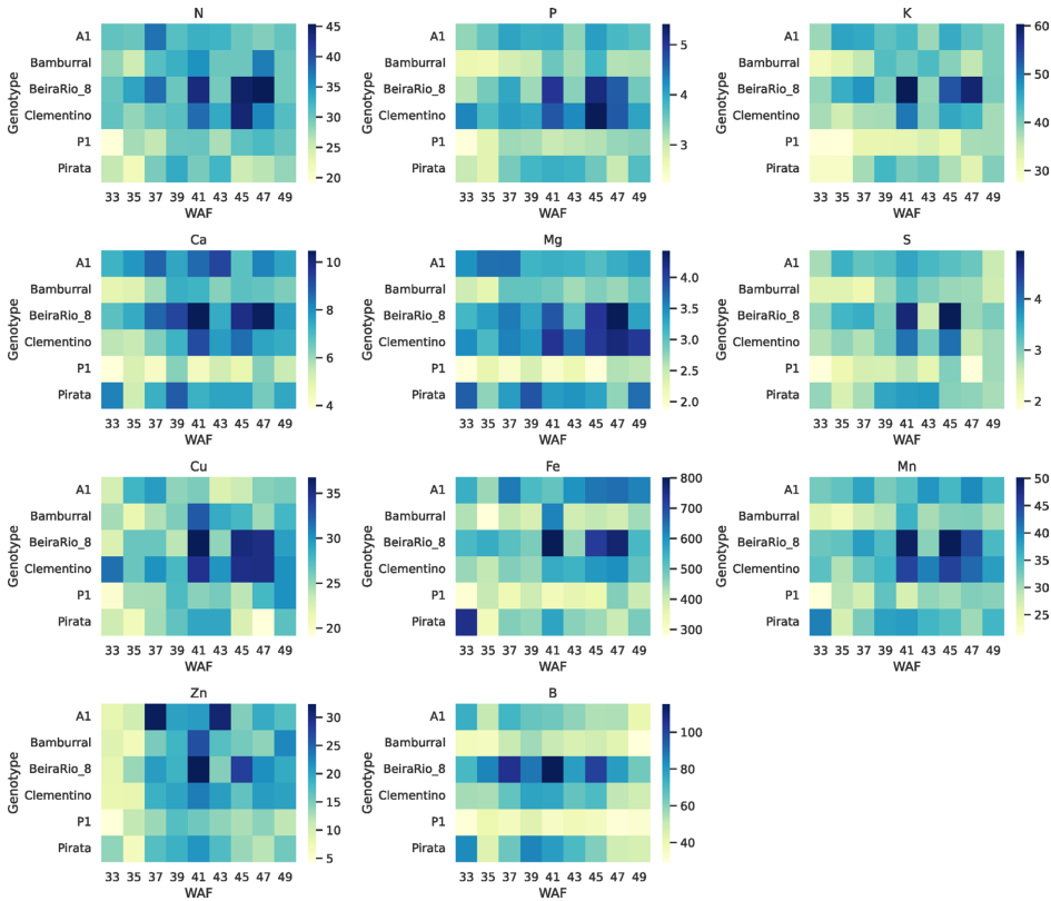 在养分分配方面,研究揭示了显著的器官特异性:豆粒是氮(N)的"储存库",其积累量占浆果总N的60%以上;而果皮则是钾(K)的"蓄水池",K浓度甚至超过豆粒中的水平。通过热图分析可清晰看到,不同基因型的养分积累高峰存在明显时序差异:早熟基因型Beira Rio 8在41 WAF即达到K积累峰值,而晚熟基因型P1直到47 WAF才出现积累高峰。