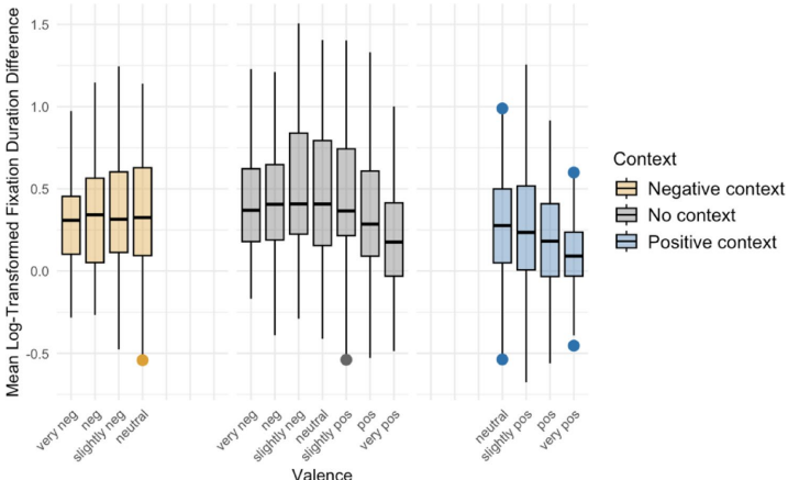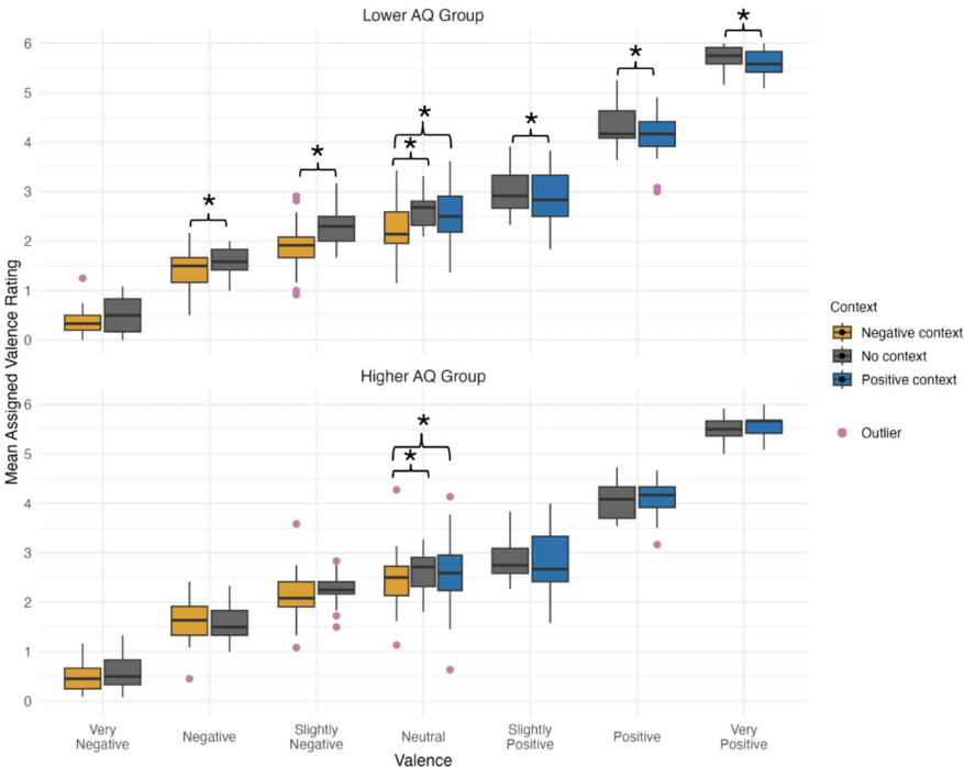 为解答这一问题,阿德莱德大学(The University of Adelaide)心理学系的Ozge Karakale团队在《Scientific Reports》发表了一项创新研究。研究人员采用三情境范式(无情境/正性情境/负性情境),结合眼动追踪技术和效价评分任务,系统考察了57名(21名高AQ组,25名低AQ组)成年人的面部情绪加工模式。关键技术包括:1)使用阿姆斯特丹动态面部表情库(ADFES-BIV)的标准化刺激材料;2)Tobii Pro眼动仪(1200Hz采样率)记录注视行为;3)7点Likert量表进行效价评分;4)基于自闭谱系商数(AQ)的分组策略(高AQ组≥26分,低AQ组≤17分)。