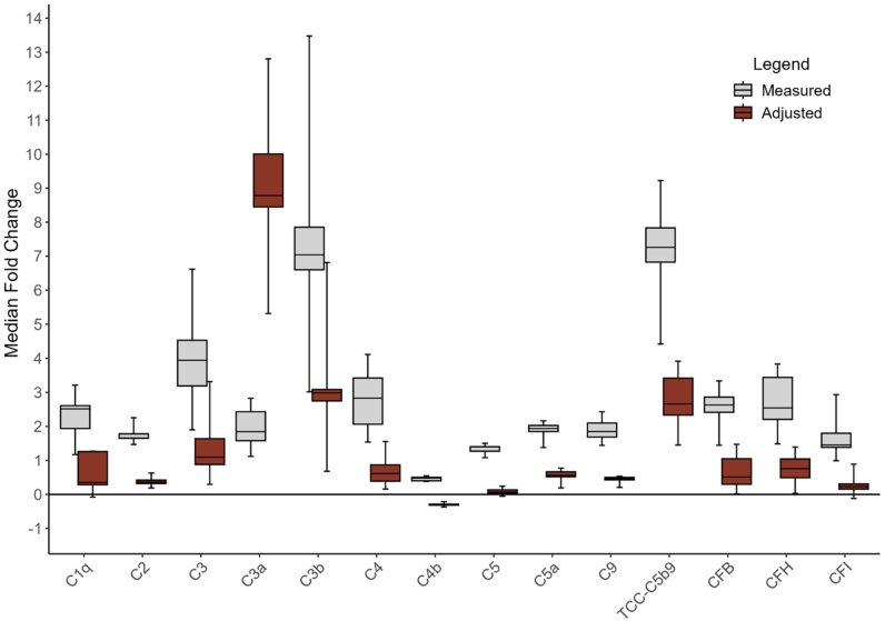 "广义线性混合效应模型"分析显示,回路暴露时间仅与C3a浓度显著相关([C3a]~CET0.618),而补体激活介质间存在强相关性,如[C3b]~[C3a]0.552和[TCC-C5b9]~[C5a]0.691。值得注意的是,补体因子B(CFB)浓度是C3b的强预测因子([C3b]~[CFB]1.130)。