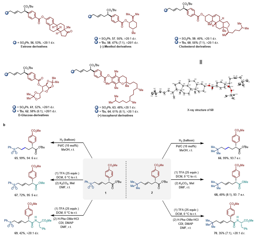 通过产物衍生化验证了方法价值:(1)Pd/C氢化保持立体构型(65,66);(2)TFA脱保护后酯化获得甲基酯(67,68);(3)氨基化反应构建非天然氨基酸(69,70)。X射线单晶衍射确认(R,E)-60的绝对构型,为机理研究提供结构基础。