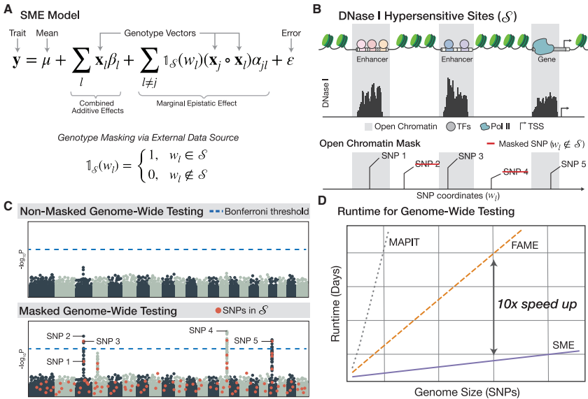 Brown大学和Microsoft Research的研究团队开发了稀疏边际上位效应(SME)测试,通过创新性地结合功能基因组数据与高效算法,实现了生物银行规模数据中上位效应的全基因组检测。该成果发表于《The American Journal of Human Genetics》,为解决非加性遗传效应研究的计算挑战提供了新方案。