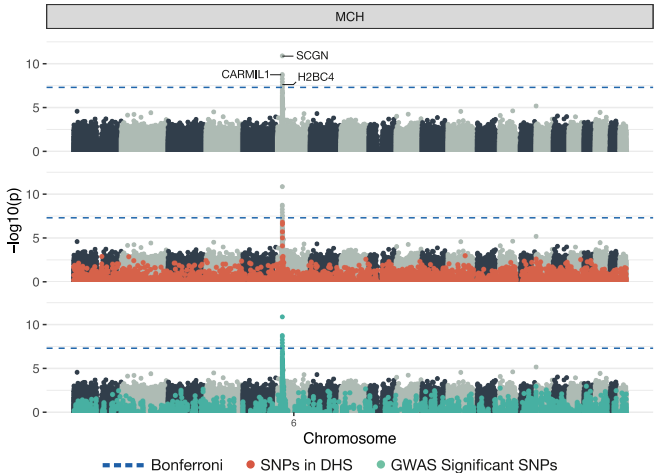应用研究中,团队使用红细胞分化期DHS数据分析血液学性状。在平均红细胞血红蛋白量(MCH)中鉴定出7个显著上位SNP(如rs4711092,p=1.41×10-11),均位于SCGN和CARMIL1等已知红细胞相关基因(表2)。