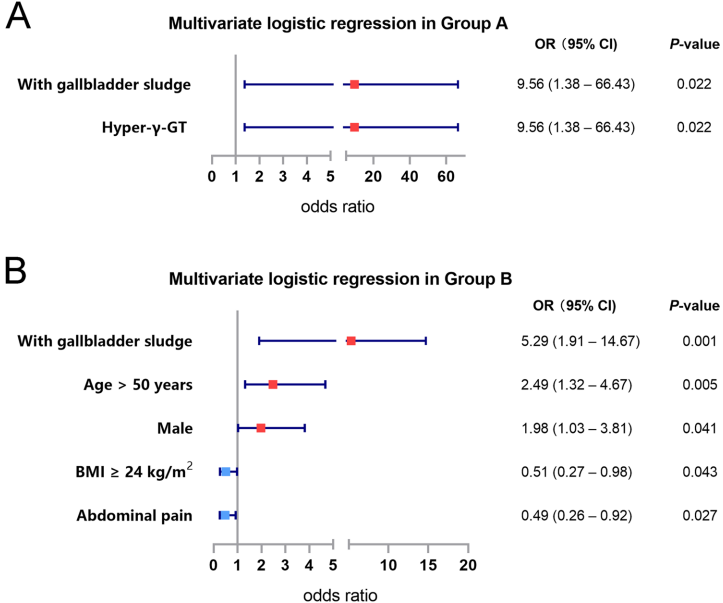 GA患者展现独特三联征:100%存在胆囊壁增厚(>3 mm)、7.2%伴γ-GT升高、21.4%OPBR患者出现碱性磷酸酶(ALP)异常。相比之下,单纯GS患者中,年龄>50岁与OPBR显著相关(OR=2.49),而肥胖(BMI≥24 kg/m2)反而具有保护作用(OR=0.51)。