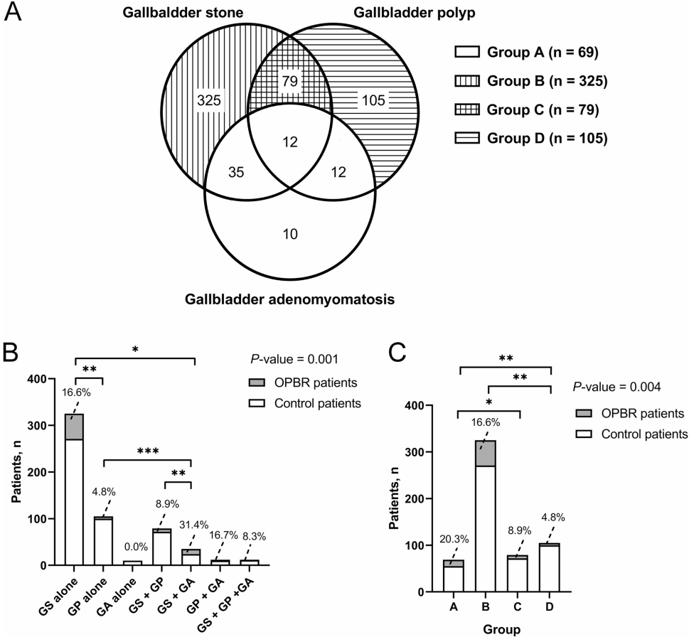 研究团队前瞻性纳入578例接受胆囊手术的患者,通过术中胆汁淀粉酶检测(>110 U/L界定OPBR)结合MRCP排除PBM,首次绘制出OPBR在胆囊结石(GS)、胆囊息肉(GP)和胆囊腺肌症(GA)中的风险图谱。研究发现,看似无害的胆囊淤泥竟是OPBR的"红色警报"——48%的淤泥患者存在OPBR,风险是普通结石患者的5.29倍。更令人意外的是,传统认为癌前病变的胆囊息肉与OPBR无关(仅7.2%),而容易被忽视的胆囊腺肌症患者却有20.3%存在OPBR,尤其当合并γ-GT升高时风险骤增9.56倍。