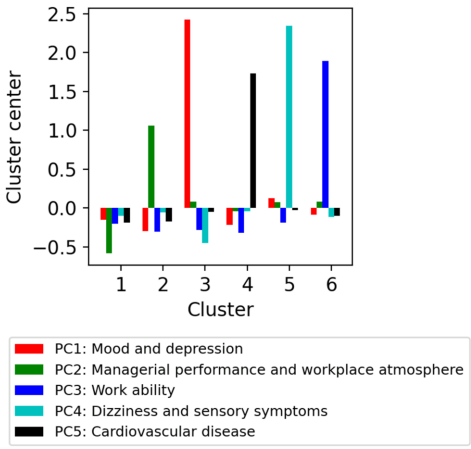研究结论指出,数据驱动的聚类方法能识别传统分析难以发现的员工风险组合模式。特别值得注意的是:1) 心血管代谢风险群体对工作能力的主观评估与实际风险存在偏差;2) 改善管理质量(Cluster 2)可能比健康干预更能减少短期病假;3) 症状高负荷群体(Cluster 5)需要心身医学干预而非单纯器质性疾病治疗。这些发现为精准化职业健康管理提供了科学依据,建议将聚类分析纳入企业健康报告系统,实现资源优化配置。