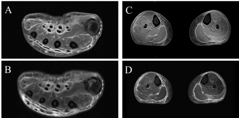 MRI特征性表现为:腕管区肌腱鞘环形强化(T1序列)、小腿腓肠肌筋膜呈"轨道样"增厚(T2序列)。影像学改变与病理分期高度吻合,证实MRI可作为动态监测工具。