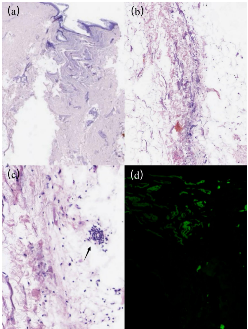 尽管未检出嗜酸性粒细胞浸润,但组织学显示三个确诊依据:皮下胶原纤维增生、筋膜层淋巴细胞-浆细胞浸润、IgM在脂肪间隔沉积。这种"三联征"为EF早期诊断提供了新标准。
