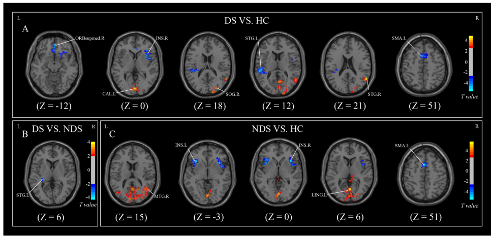 研究采用严格诊断标准,通过中国版综合征诊断量表(SDS)区分DS与NDS亚型。影像数据采集使用3.0T GE HDx扫描仪,结构像采用MPRAGE序列(1mm3各向同性分辨率),功能像采用EPI序列(4mm3体素)。预处理通过DPABISurf_V2.0工具箱完成,包括N4偏场校正、FreeSurfer7.2.0皮层重建和ANTs非线性配准。功能连接分析以AAL模板定义的杏仁核为种子点,采用GRF校正(voxel p<0.01, cluster p<0.01)。中介分析通过AMOS24.0实现,验证AMYG.L体积和AMYG.L-STG.L功能连接的中介效应。