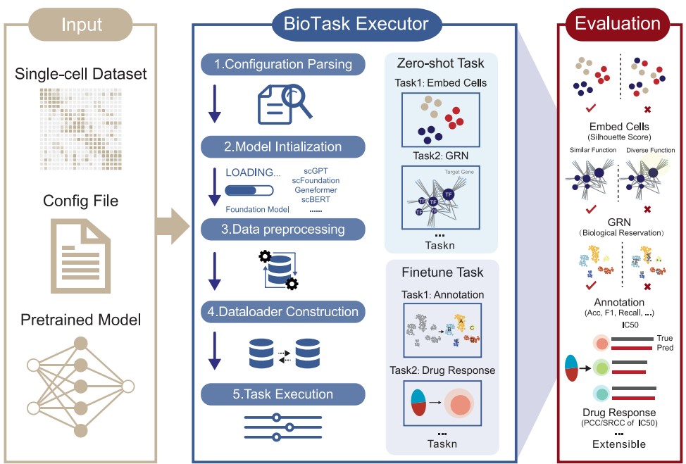 BioLLM框架由三个核心组件构成:输入模块负责接收数据和配置参数;BioTask执行器通过五步流程完成任务处理;评估模块则对结果进行多维度分析。这种设计使研究者能够轻松切换不同模型,同时保持分析流程的一致性。