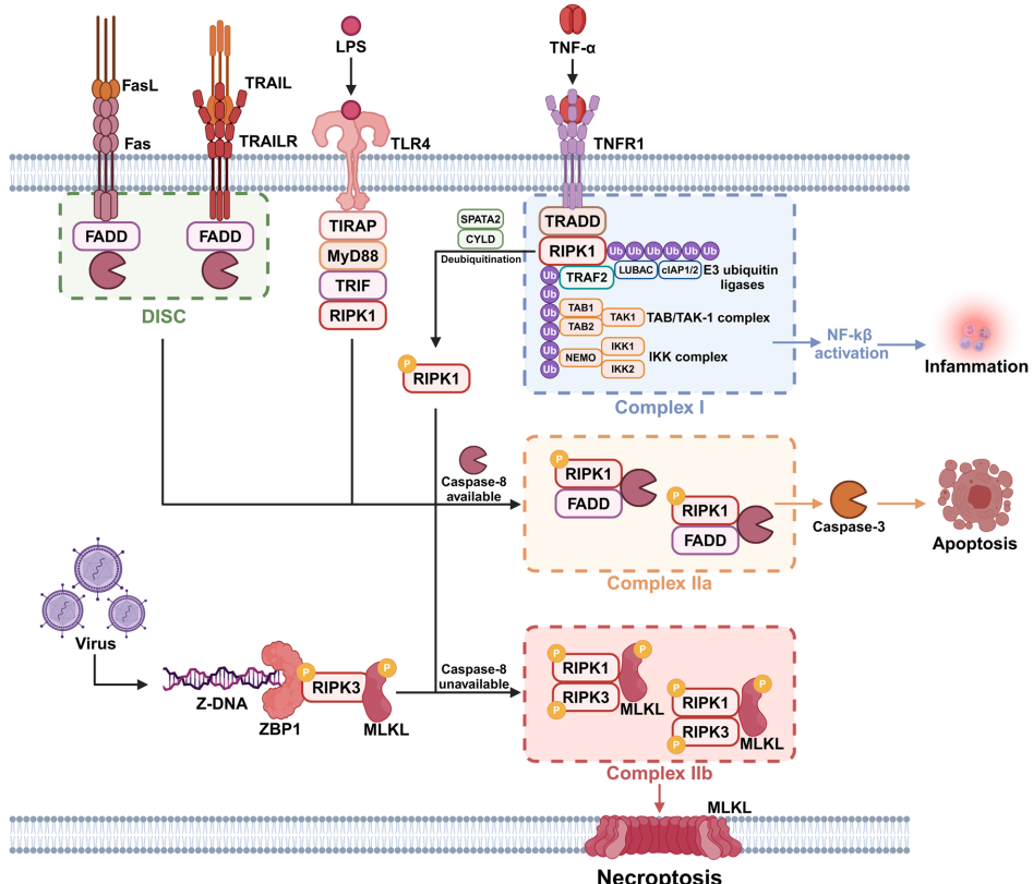 磷酸化修饰形成精密调控网络:RIPK1 S166自磷酸化是激活标志,而IKK介导的S25磷酸化则抑制其细胞毒性;RIPK3 S227被CK1或自身磷酸化后招募MLKL,而Ppm1b通过去磷酸化该位点抑制坏死性凋亡。泛素化修饰呈现双向调控:PELI1介导RIPK1 K115位K63连接泛素化促进坏死小体形成,而CHIP通过K48连接泛素化导致RIPK3溶酶体降解。