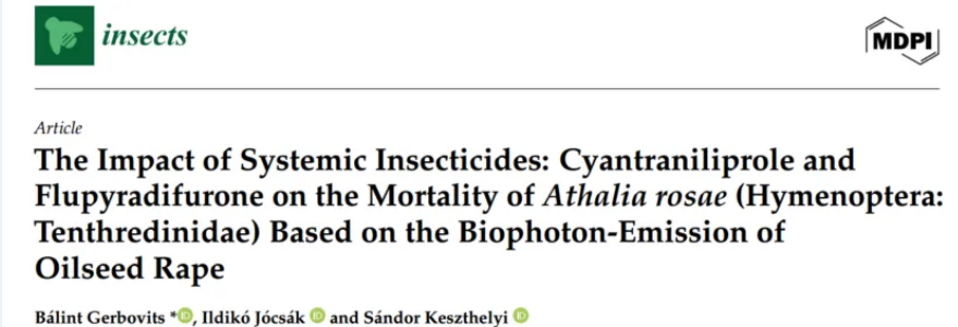 该文借助 NightSHADE LB 985植物活体成像系统,实时监测冬油菜在接受氰虫酰胺或氟吡呋喃酮处理后的延迟荧光(DF)与超弱生物发光(UWLE)信号,发现两种系统性杀虫剂均可通过向上(木质部)和向下(韧皮部)双向传导,在96小时内使芜菁叶蜂幼虫全部死亡。同时,杀虫剂显著提升了植物单位叶面积的光合活性(DF升高35–70%)与氧化代谢水平(UWLE升高45–50%),而受害虫啃食的未处理植株则表现出光合抑制和代谢紊乱,从而验证了新型杀虫剂在高效控害与增强作物抗逆性方面的双重潜力,如表1&2所示。